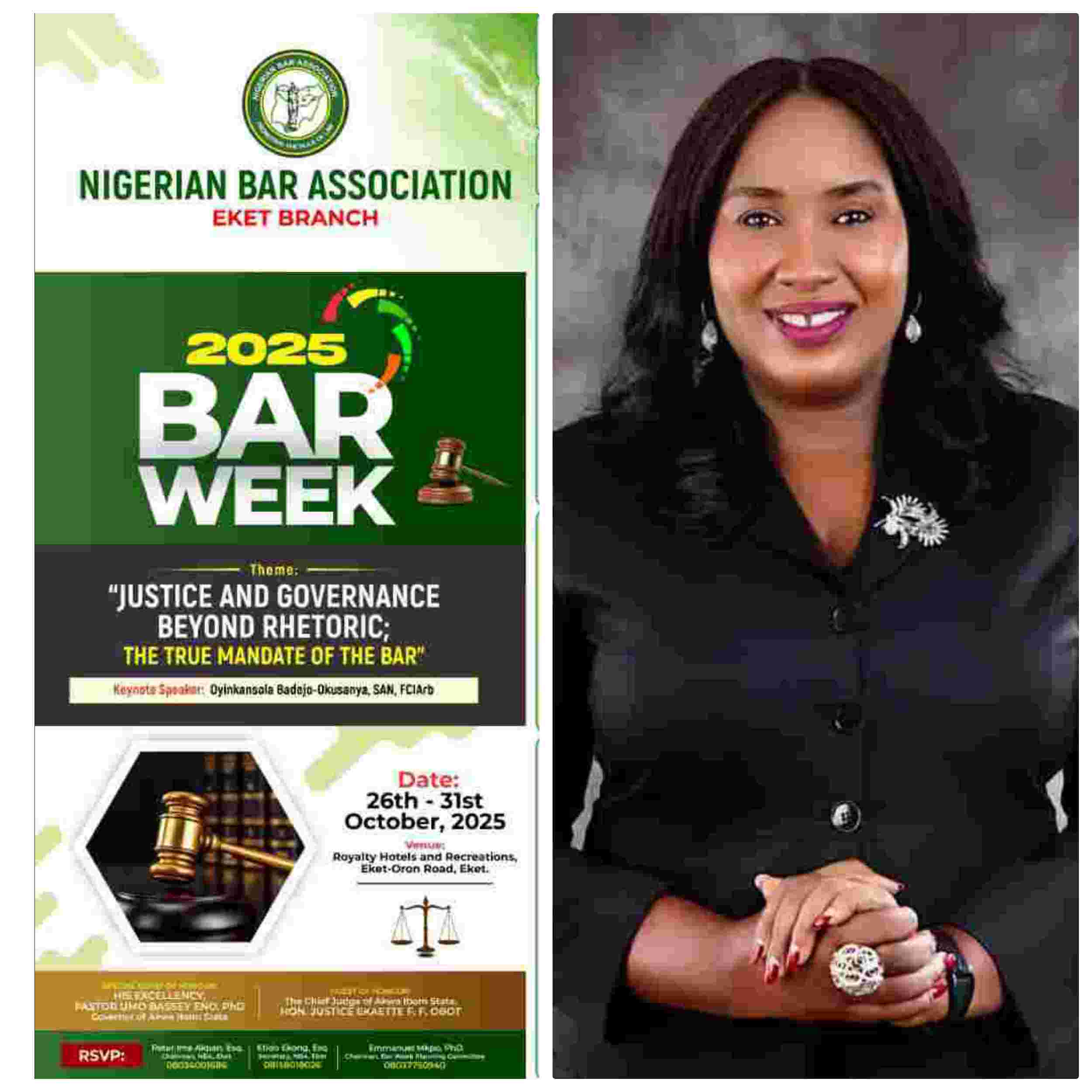 The Nigerian Bar Association (NBA), Eket Branch, has announced its 2025 Bar Week, themed “Justice and Governance Beyond Rhetoric: The True Mandate of the Bar.” The week-long event will take place from October 26th to 31st, 2025, at Royalty Hotels and Recreations, Eket, Akwa Ibom State.